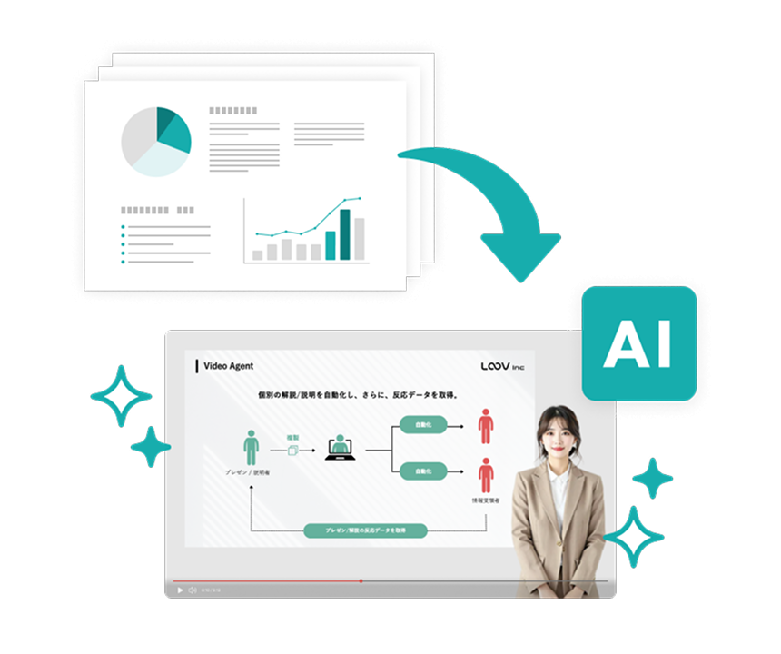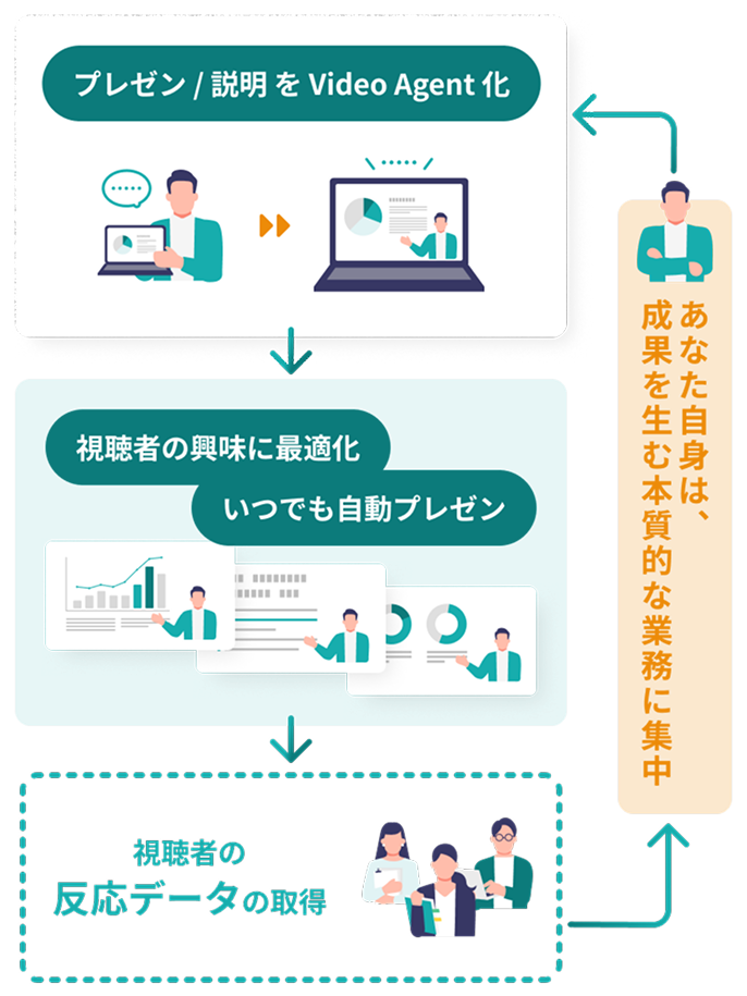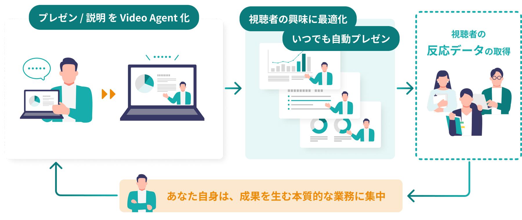 誰でも簡単にハイパフォーマーのプレゼンテーションを再現したVideo Agentを作成できます。説明資料の準備時間を大幅に削減し、担当者は顧客対応に集中できます。- 説明資料の準備時間を大幅削減