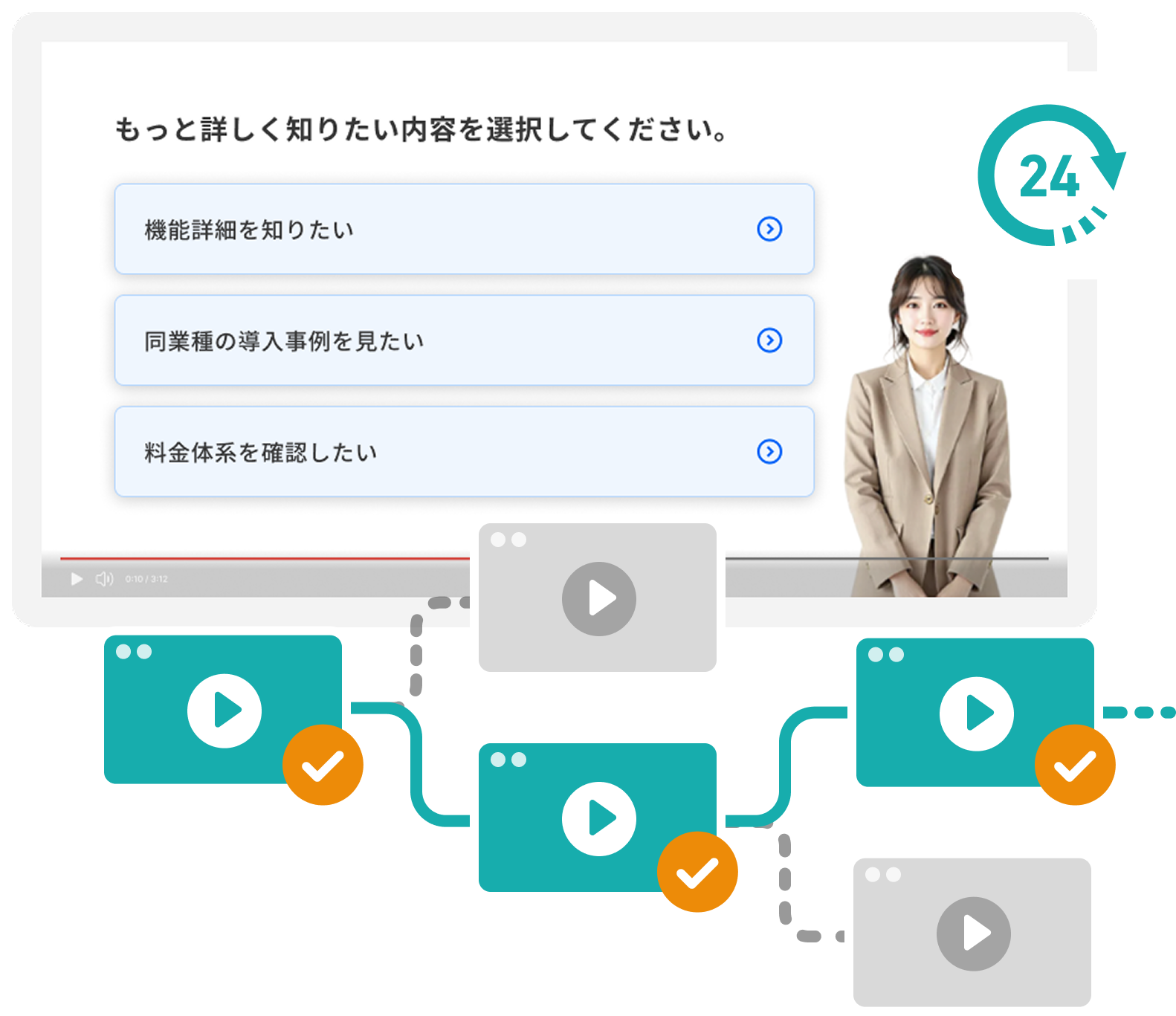 Video Agentが顧客からのよくある質問や機能に関する疑問に対して、インタラクティブに回答を提供します。従来は問い合わせ対応やサポートチケット処理にCS担当者の時間が取られていましたが、Video Agentが顧客の質問内容に応じて最適な説明動画・操作手順・トラブルシューティングを24時間自動提供することで、顧客の自己解決率が劇的に向上します。CS担当者は定型的な問い合わせ対応から解放され、複雑な課題解決や戦略的な顧客支援に時間を集中でき、サポート品質の向上と工数削減を同時に実現できます。