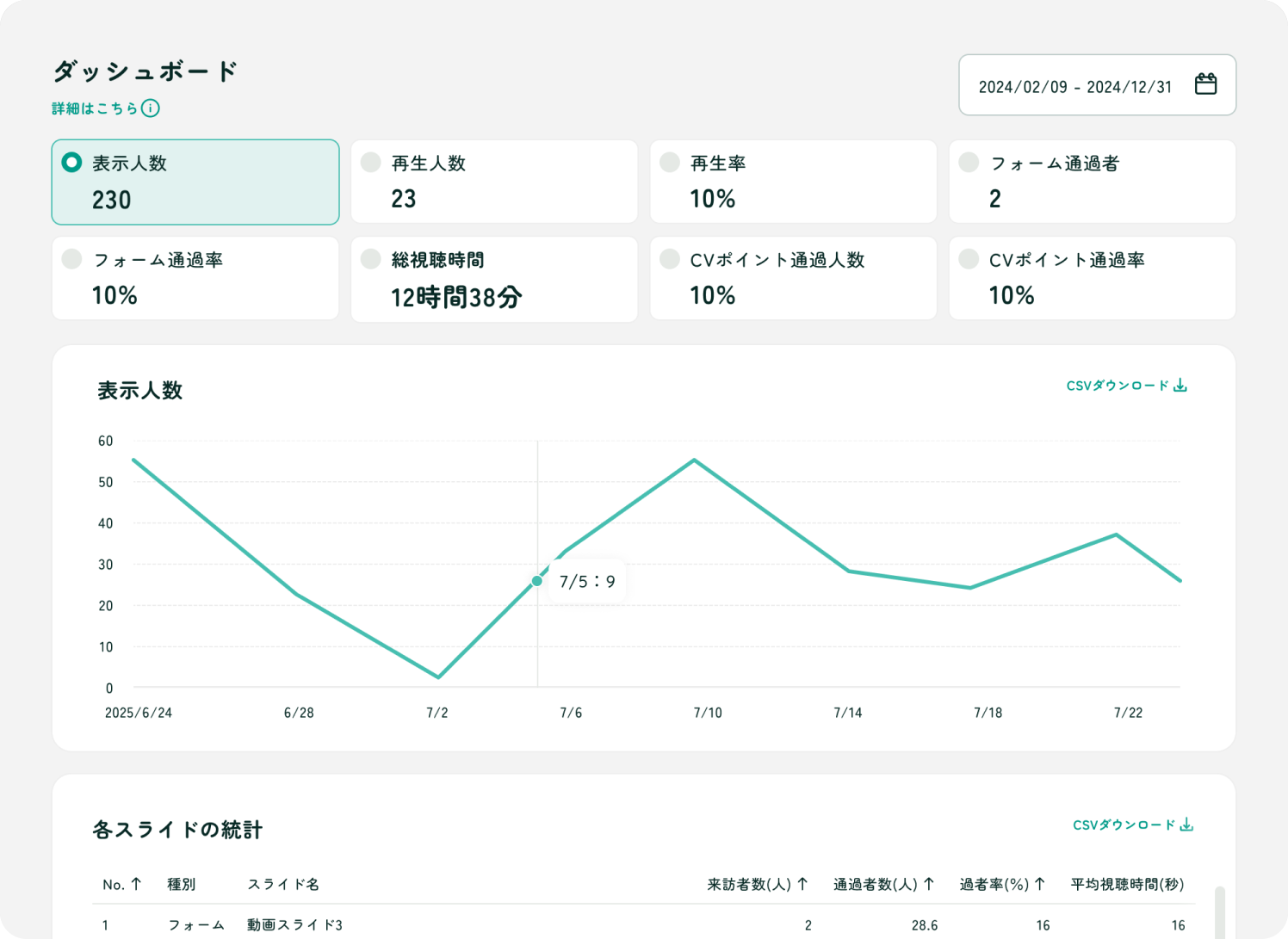 Video Agentが顧客の視聴行動(どのコンテンツを・いつ・どれだけ視聴したか)と選択した質問項目を全て構造化データとして蓄積・分析します。Video Agentが顧客の具体的な関心領域(活用したい機能・抱えている課題・上位プラン検討状況)をリアルタイムで可視化することで、CS担当者はプロアクティブな支援とアップセル提案のベストタイミングを正確に判断できます。データドリブンな顧客支援により、解約率の削減・アップセル率の向上・顧客満足度の向上を同時に実現し、LTVを最大化できます。