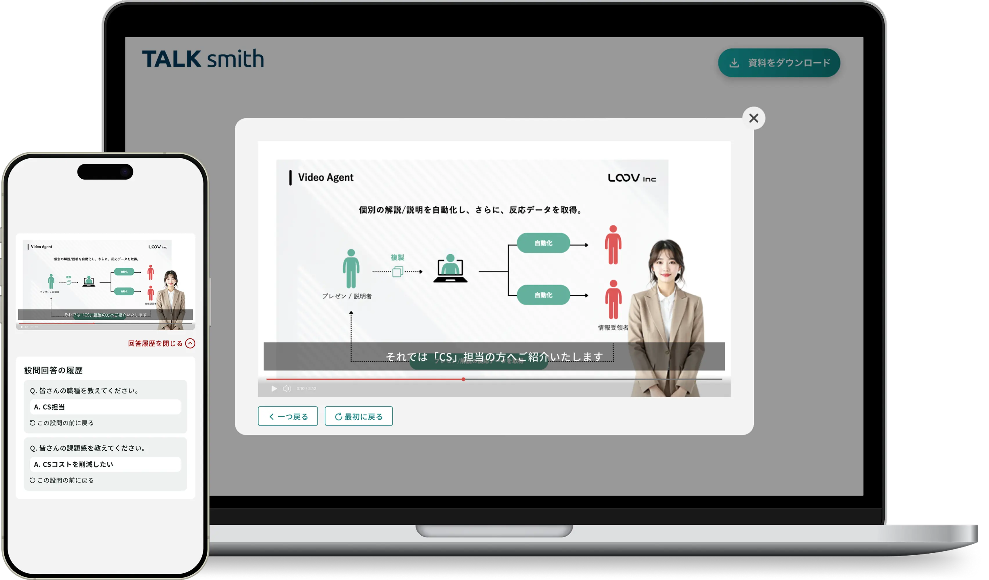 Video Agentでは、視聴者がどの部分を見たか、どの設問をクリックしたかなど、詳細なデータを取得できます。この情報を基に、顧客の関心を深く理解し、次のアクションに活かすことができます。データを活用することで、パーソナライズされた提案やアプローチが可能になります。